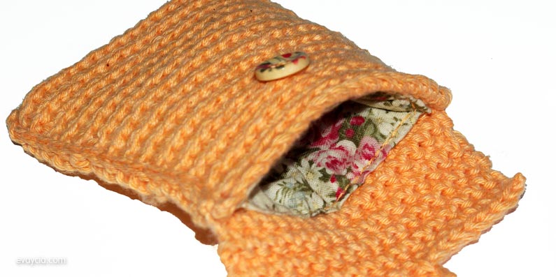 Volvemos a dar la vuelta al tejido y terminamos de unir el forro con unas puntadas alrededor de todo el borde superior. Por último, añadimos el botón para el cierre y… ¡estará listo! Simplemente modificando el número de cadenas iniciales, el número de filas tejidas o el tipo de hilo empleado, podéis crear infinidad de modelos diferentes.